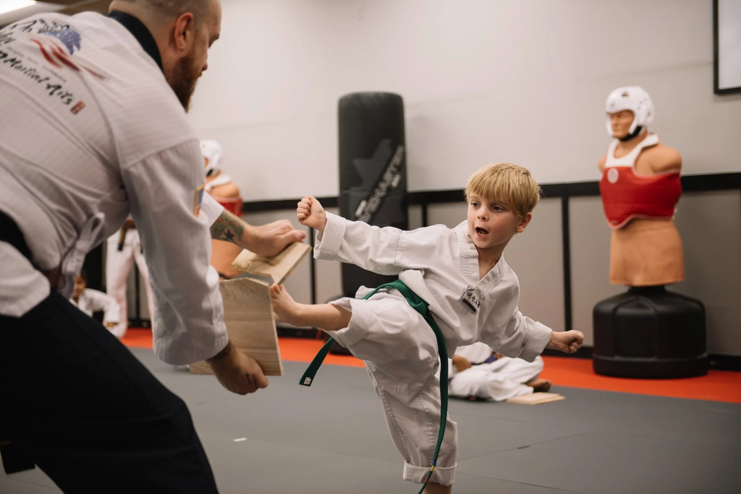 Children gain focus, self-confidence, and respect while learning Taekwondo in a fun, active setting.